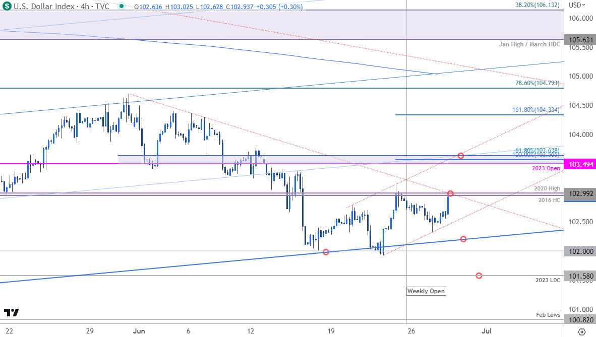 美元指数较月内低点上涨逾1%DXY目前测试第一个6月下行阻力位。随着价格在月/季度末于年内区间收缩,战线愈发清晰。以上是DXY短期技术图表上重要的最新目标位和研判点位。